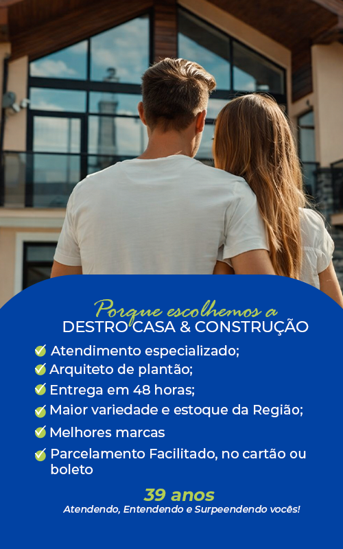 Se você está em busca de qualidade e variedade em materiais para a sua reforma ou construção, a Destro é a escolha certa. Desde 1986, somos referência em materiais para acabamento, com ampla variedade de produtos e atendimento especializado. Nas cidades de Bragança Paulista, Atibaia e Jundiaí, você encontra nossas lojas que se destacam pela excelência em pisos, porcelanatos, revestimentos, louças, metais e muito mais. Nossos vendedores, promotores e projetistas estão prontos para Atender, Entender e Surpreender você na escolha dos melhores materiais. Conte com a Destro para transformar seus sonhos em realidade. Soluções inovadoras, atendimento excepcional e produtos de alta qualidade para sua obra.